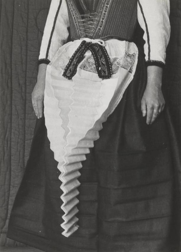 Wit bruidsschort van Marken, lang bewaard met de vouwen erin. Het textiel wordt te kwetsbaar om helemaal uit te vouwen, dus dragen de bruiden het schort met de vouwen intact, wat een heel mooi ‘origami’-effect heeft. Na dragen gaat het schort direct weer de spanen doos in, in zuurvrij papier.