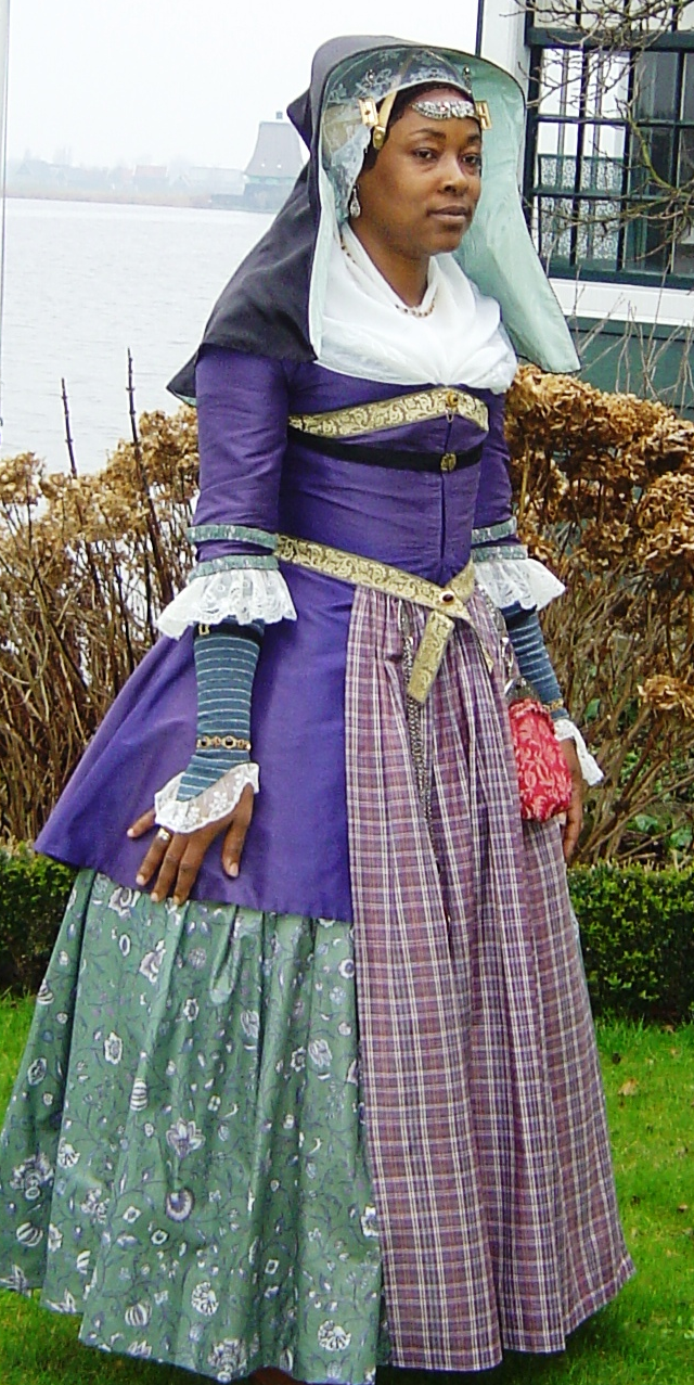 Zaanse vrouw in vol ornaat, met zijden jak, kanten mouwstroken, gouden ‘kap’ (kanten muts en sieraden met edelstenen), kaper (hoed/capuchon over de gouden kap), borstlinten, beugeltas en chatelaine (zilveren naaigerei aan een tuigje, gedragen over het schort). Beeld: De Zaanse Kaper.