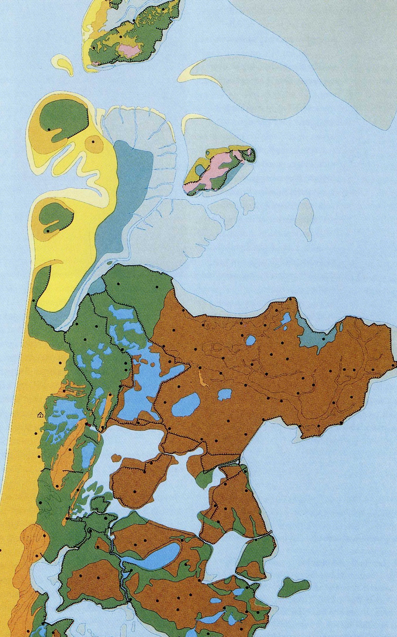 Noord-Holland circa het jaar 1350. De Zuiderzee is in wezen een tak van de Waddenzee. Stukken land verdwenen regelmatig onder water, terwijl elders stukjes land weer droogvielen. Beeld: Canon van Nederland.