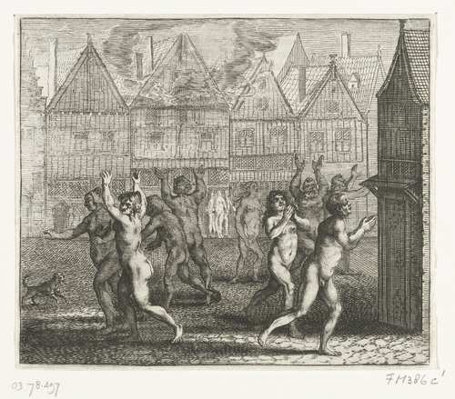 Wederdopers jeremiëren (ja, ik moest het woord ook opzoeken) naakt door winters Amsterdam, februari 1535. Een fatsoenlijke vrouw houdt natuurlijk wel haar hul op (de persoon links). Beeld: Collectie Catharijneconvent, Utrecht.