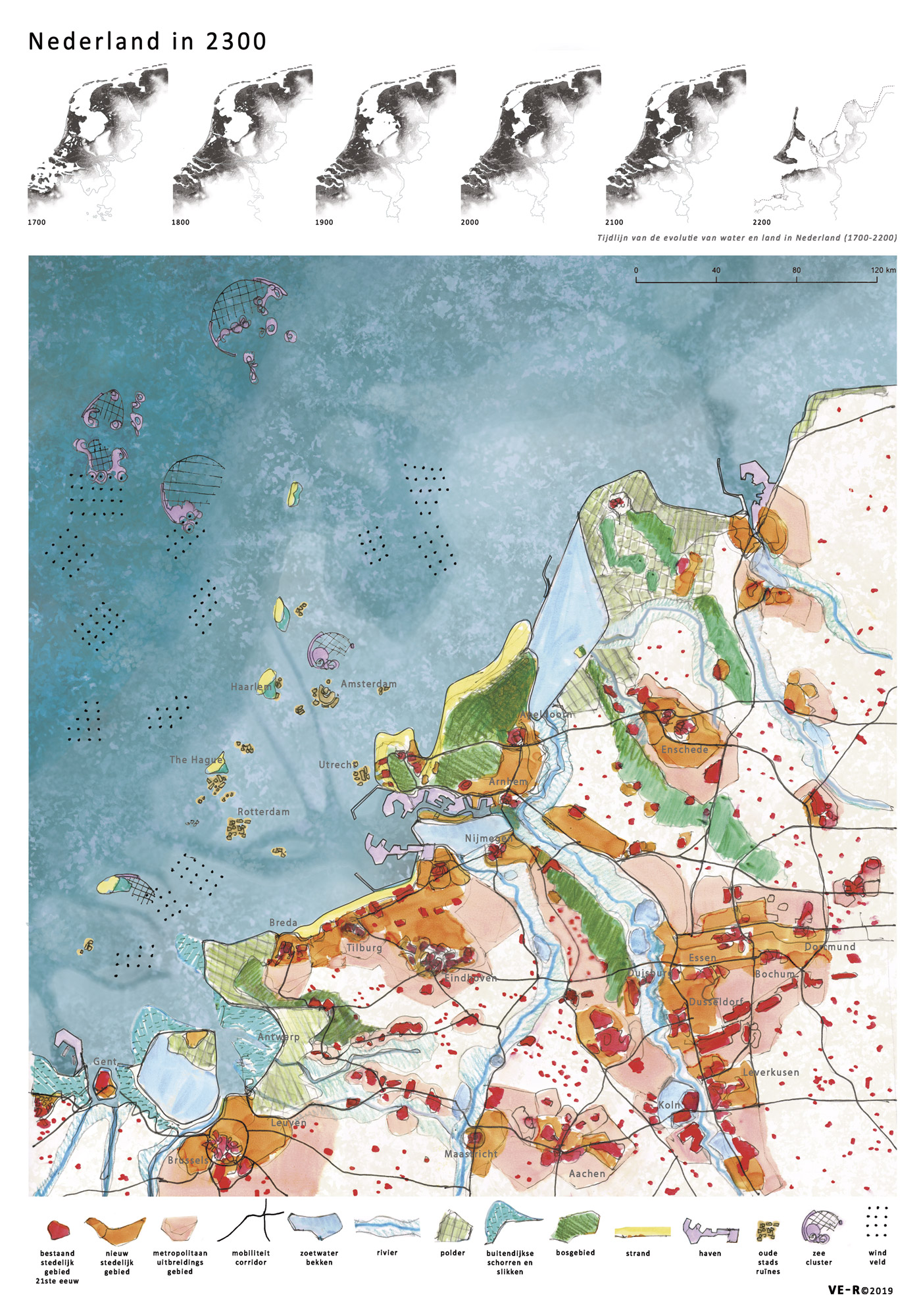 Het water komt. Nederland in 2300 volgens landschapsarchitecten VE-R (Remco Rolvink en Berrie van Elderen). Voor meer toekomstschetsen kijk op de website van Blauwe Kamer Ezine.