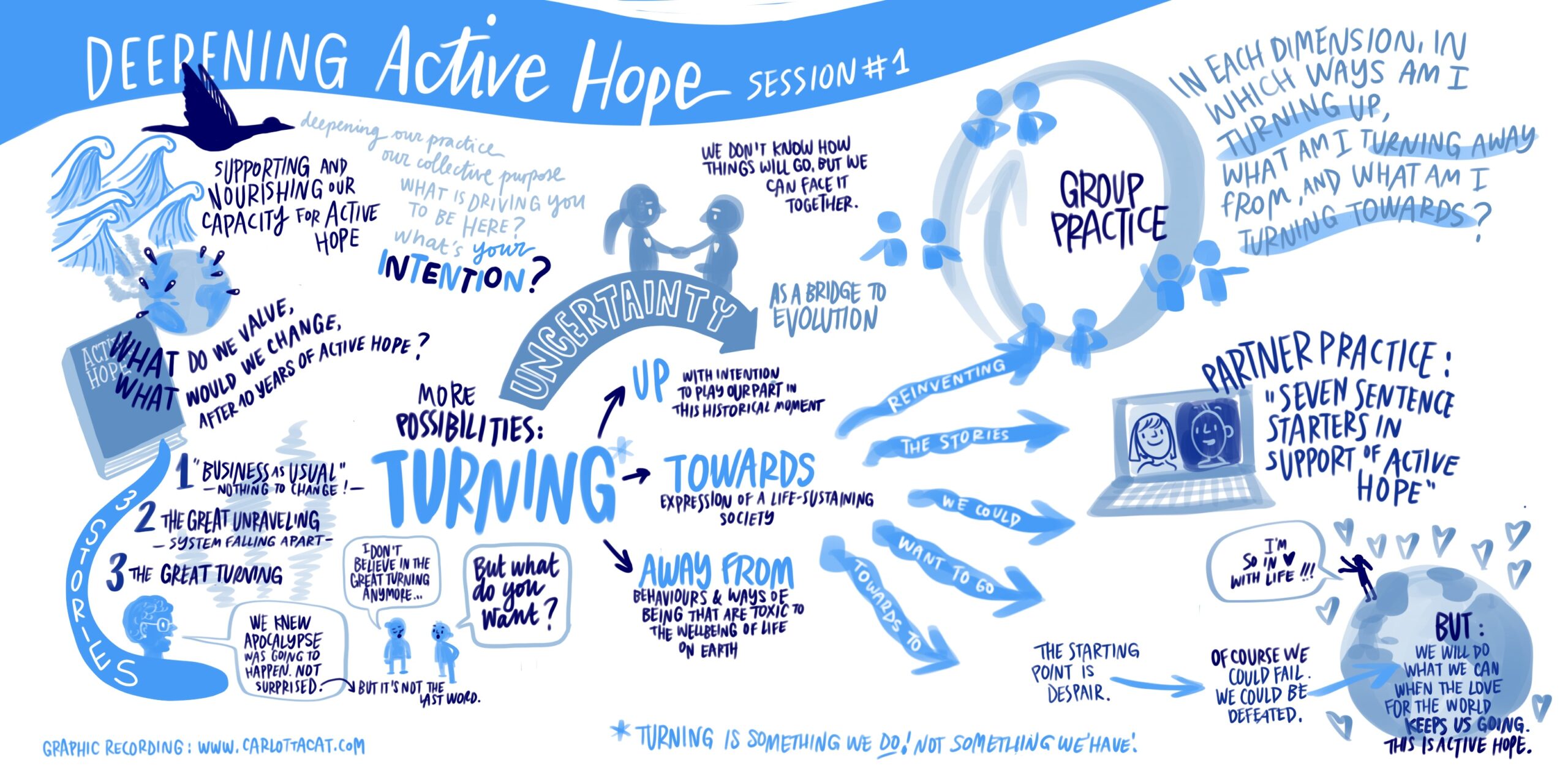 Inmiddels wekken mensen die zich openlijk verheugen op een spoedige vliegvakantie, inclusief journalisten die beter kunnen weten, een grote irritatie, snijdende hartezeer en verlammende moedeloosheid bij me op. Het is dan erg moeilijk voor me om de moed erin te houden, ondanks het hart onder de riem in Active Hope. How to Face the Mess we’re in Without Going Crazy. Beeld: activehope.info.