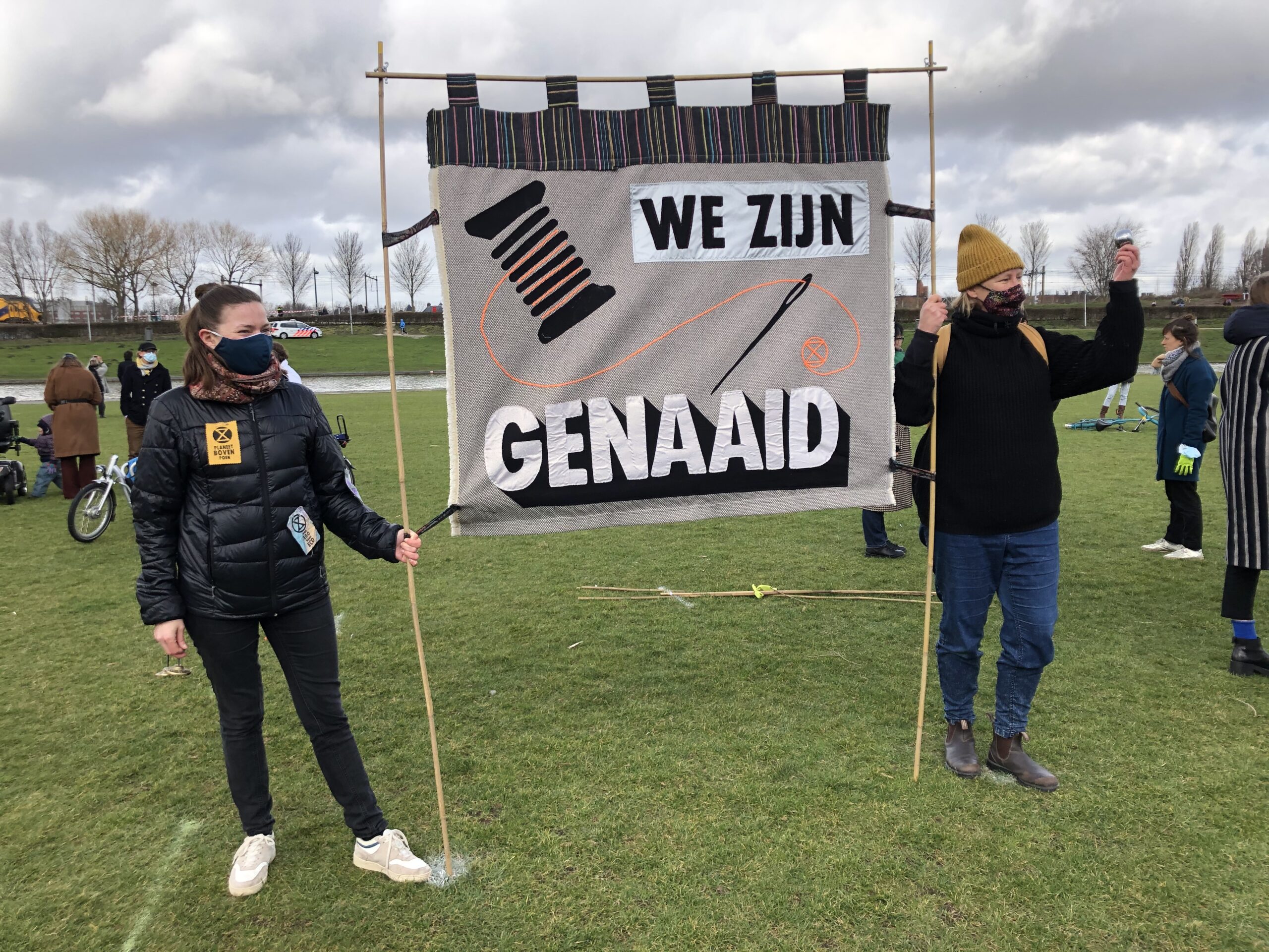 Klimaatalarm 2021, Westerpark. Spandoek met appliqué van Extinction Rebellion. Beeld: Teresa van Twuijver.