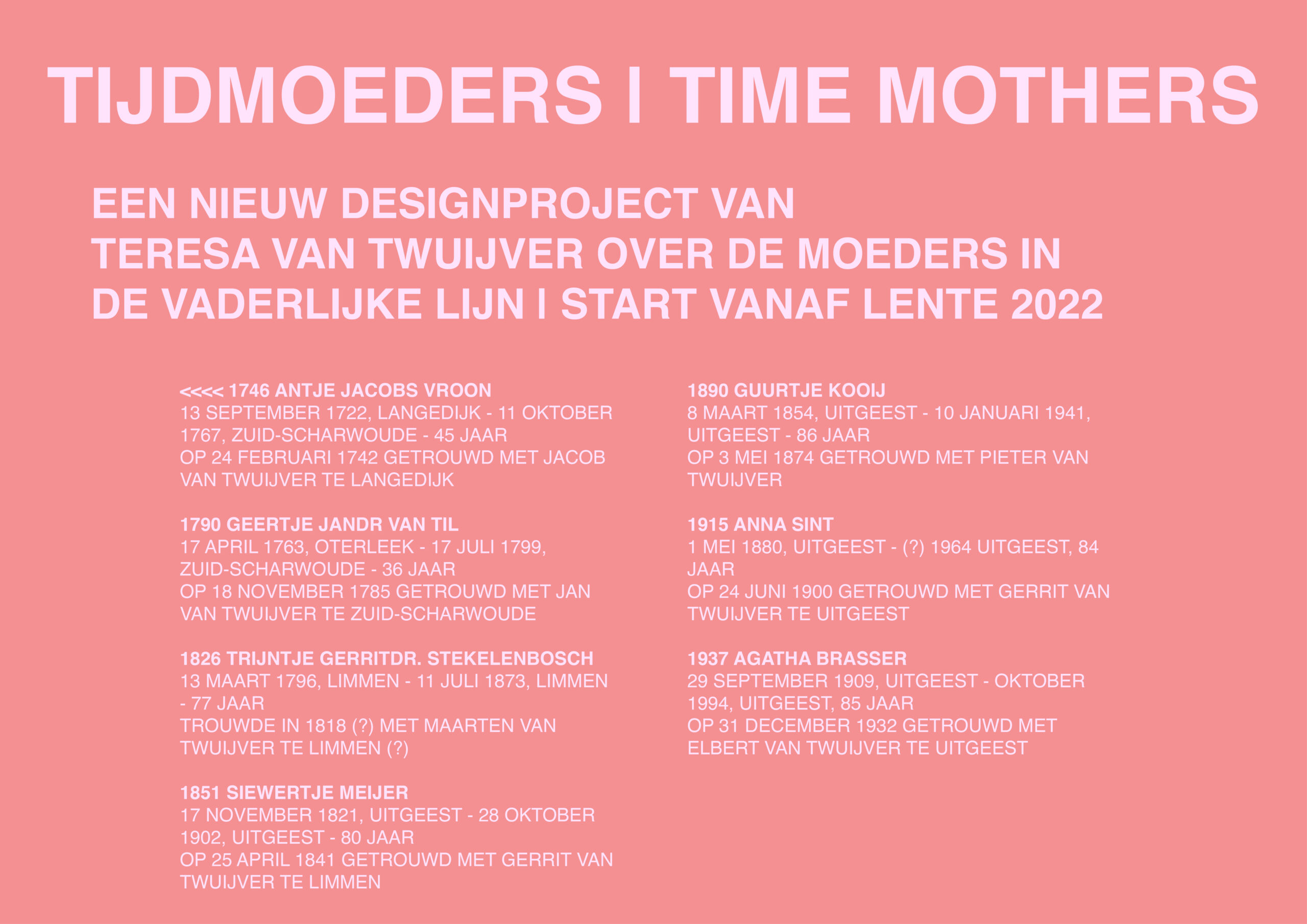 In dit meerjarige speculatieve designproject kijk ik niet naar de toekomst maar naar het verleden. Ik wil mijn ‘voormoeders’ uit de vaderlijke lijn onderzoeken en reconstrueren. Voorlopig tot ik ben aangeland in het midden van de 18de eeuw, toen Antje Jacobsdr. van Twuijver-Vroon met haar echtgenoot Jacob van Twuijver (mijn directe voorouders) deze stolpboerderij lieten bouwen in het Westfriese Zuid-Scharwoude. De boerderij staat sinds 1948 in het Nederlands Openluchtmuseum.